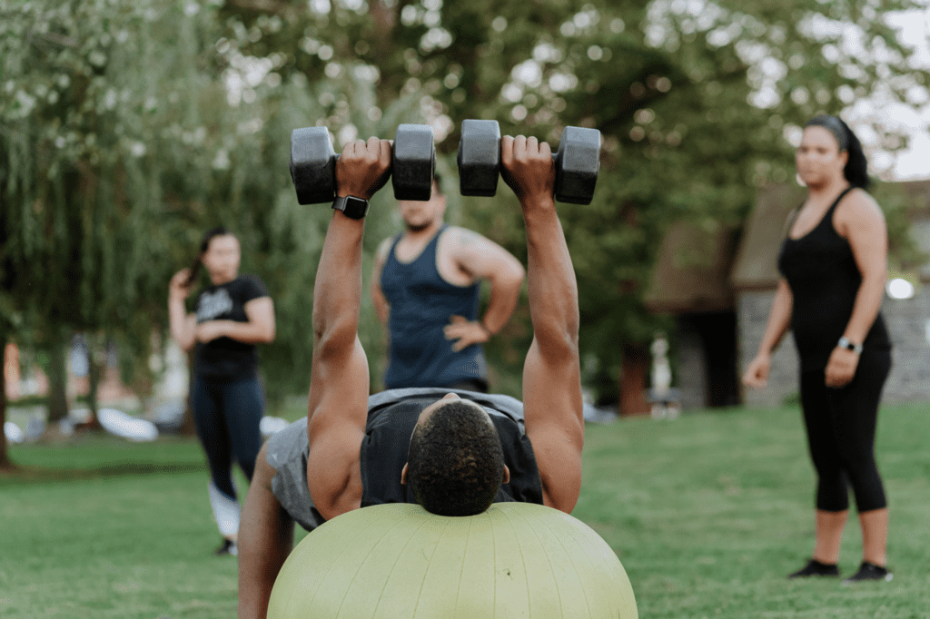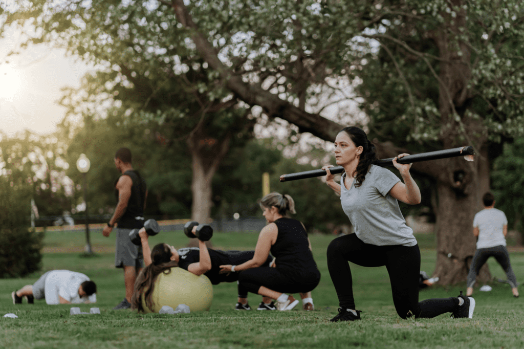 Fitnesstraining, Herzkreislauftraining und Muskeltraining in der Gruppe draußen im Freien.