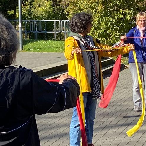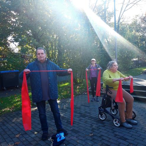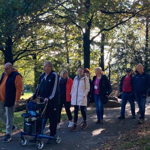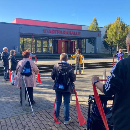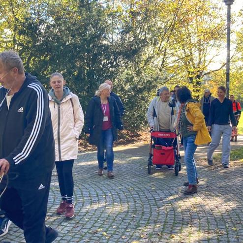 Nach einem kurzen „Get together“ und der Begrüßung durch die Verantwortlichen ging es nach draußen zu einem schwungvollen „Warm-up“. Anschließend begaben sich die Teilnehmer auf eine Runde durch den Stadtpark. Unterbrochen wurde der Spaziergang von einigen Stationen, an denen die Teilnehmer, angeleitet von Natalie Klupsch, unterschiedliche Übungen mit dem Theraband, einige Atemübungen sowie Atem erleichternde Stellungen ausführten. Darüber hinaus wurden Informationen zu verschiedenen Krankheitsaspekten vermittelt.