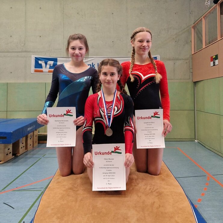 Clara Reuter (2009) schaffte es aufs Treppchen und erreichte den 3. Platz, gefolgt von Josephine Eilers (2008) auf dem 4. Platz. Damiana Parassidis (2010) belegte in ihrer Altersklasse den 6. Platz. Somit kamen alle drei Turnerinnen unter die Top Ten und konnten sich für die Rheinische Meisterschaft qualifizieren.