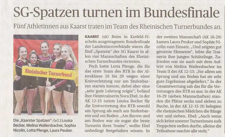 Das Kunstturnen oder auch Gerätturnen genannt ist eine Individualsportart mit dem Ziel, an Turngeräten bestimmte Übungen nach vorgegebenen Kriterien der Technik und Haltung in verschiedenen Verbindungen auszuführen. Das Kunstturnen ist ein Basissport und umfasst die 4 Geräte: Sprung, Stufenbarren, Schwebebalken und Boden. Schauen Sie sich hierzu gerne unser Video: „Das Training des Turnteams der SG Kaarst“ an.